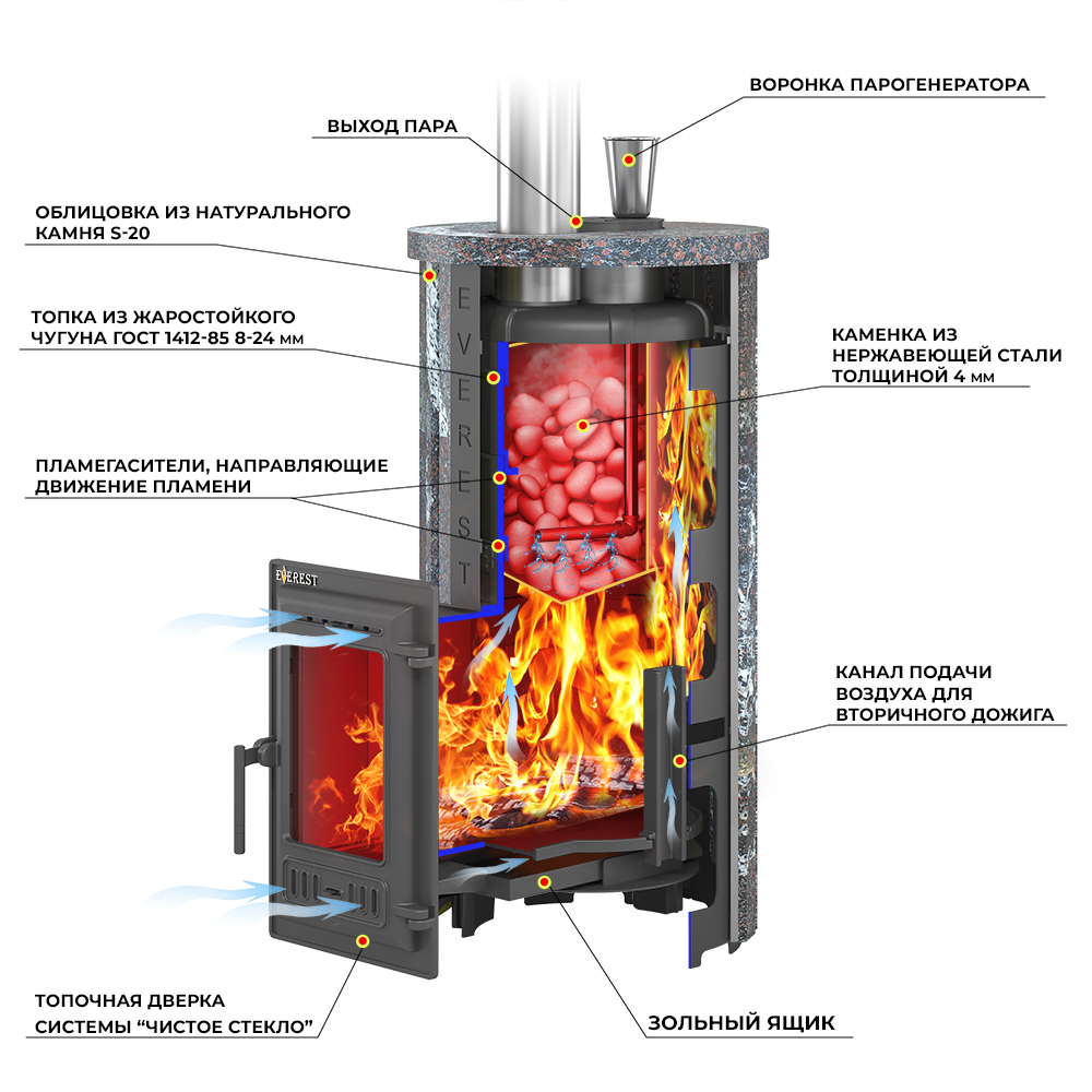 Топочная камера печи – сборная, состоит из трёх деталей, соединяемых между собой на болтах. Вертикальные швы по краю деталей соединяются по принципу паз-гребень, что обеспечивает высокую герметичность топки и минимальную деформацию даже при длительном нагреве. Соединение не требует применения уплотнителей шва, достаточно только герметика. Верхняя часть топки изготовлена из чугунных колец. В печи Эверест "Steam Master" 30 ЧУГУН Ламель Талькохлорит, S-20 между топкой и крышкой размещено два кольца высотой 120 мм. Для полного сгорания топлива в топке устроены каналы вторичного дожига, подающие воздух из поддувала в верхние точки камеры, в места скопления разогретых газов.