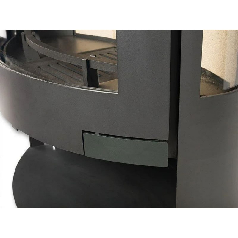 Печь-камин Panadero Iris помимо стильного современного дизайна отличается технологичностью. У печи большая топочная камера и внушительных размеров стекло. Но при этом печь позволяет с относительно небольшой закладки дров получить большой красивый огонь. И напротив, если необходимо прогреть помещение, печь способна отопить комнату объемом до 240 м3. Отзывчивость на регулировки и способность хорошо гореть при минимальной подаче воздуха достигается за счет футеровки топочной камеры вермикулитом, а также правильно спроектированной подачи воздуха.